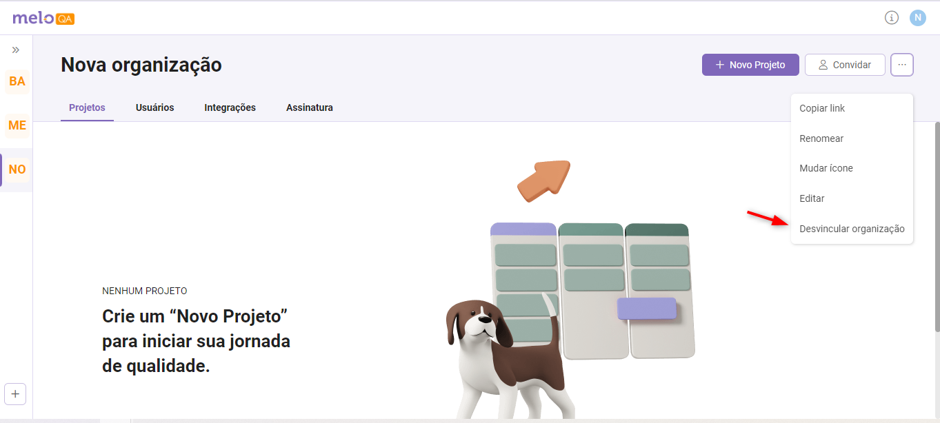 Caso você não queria mais participar de uma Organização em que não é o Proprietário, clique em "Desvincular organização" no menu de 3 pontinhos.