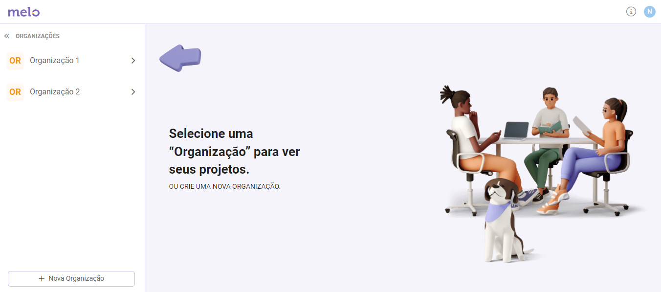 Se outro usuário já tiver te incluído em uma Organização, ela será exibida na listagem de Organizações: